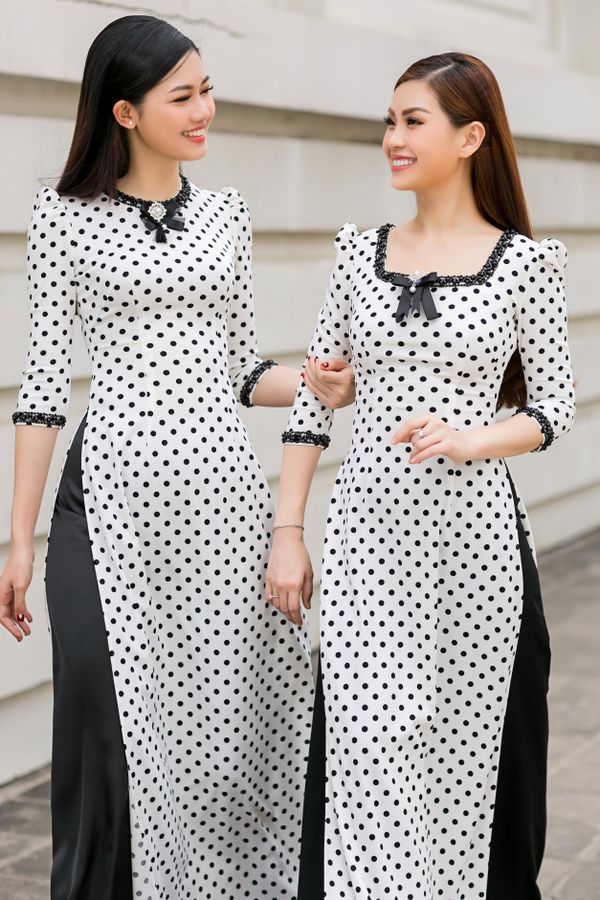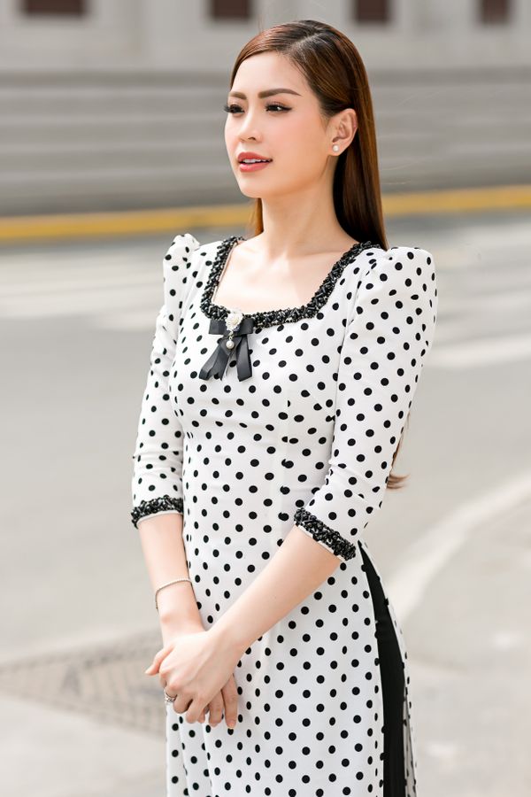 Không chỉ Diễm Trang, á hậu Thanh Tú cũng lựa chọn tà áo dài chấm bi này để trở nên duyên dáng trên phố.