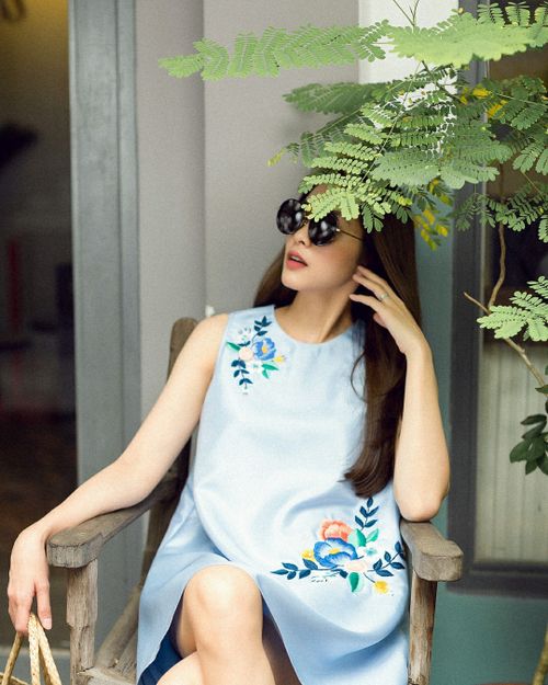 Tăng Thanh Hà với thiết kế váy chữ A suông màu xanh pastel kết hợp với những họa tiết thêu nổi tinh xảo khiến cô ngày càng có khí chất của một quý bà thời thượng. Hà Tăng luôn chú trọng sự đơn giản và tinh tế nên cô không tham lam quá nhiều phụ kiện mà chỉ chọn một chiếc mắt kính to bản màu đen để tôn thêm phần thanh lịch.