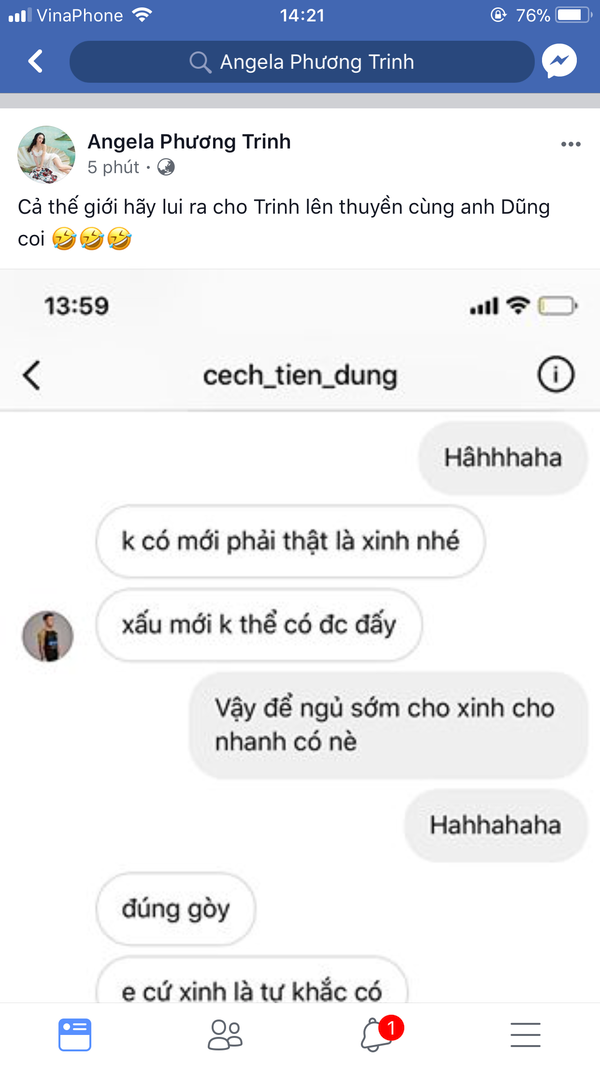 Cụ thể, trước lời tỏ tình của nữ diễn viên sinh năm 1995, tài khoản được cho là của Bùi Tiến Dũng thật thà chia sẻ thực ra mình mới là fan của Angela Phương Trinh. Tuy biết lời nói: “Anh gì ơi làm người yêu em coi” chỉ là bông đùa nhưng anh vẫn rất mừng khi được idol quan tâm.