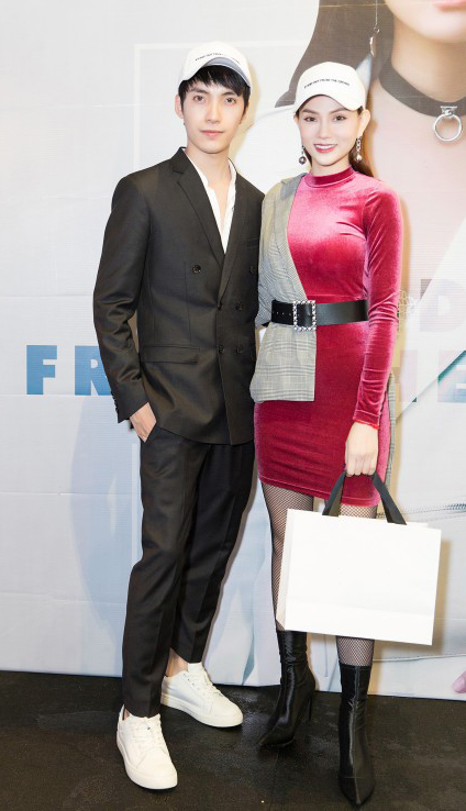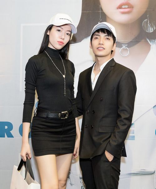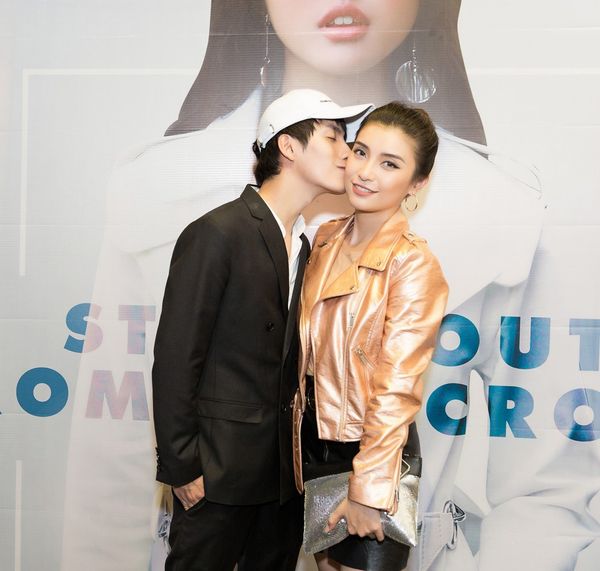 Tiêu Châu Như Quỳnh đến sự kiện với set đồ da cá tính. Kye Nguyễn bày tỏ niềm vui bằng một cái hôn khi cô đến chia vui với mình.
