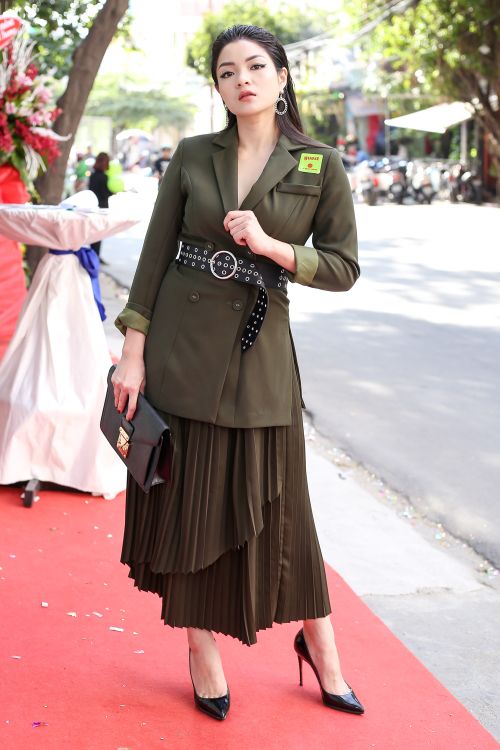 Cô diện áo blazer bên ngoài chân váy dài xếp tầng cùng gam màu xanh quân đội.