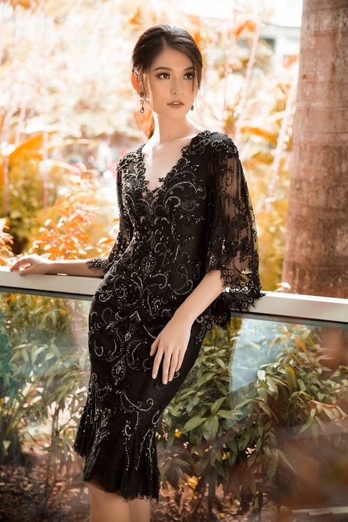 Quý phái và đầy tinh tế là hình ảnh của Thùy Dung khi diện chiếc đầm bút chì với họa tiết đính đá và tua rua cầu kì của NTK Lê Thanh Hòa.