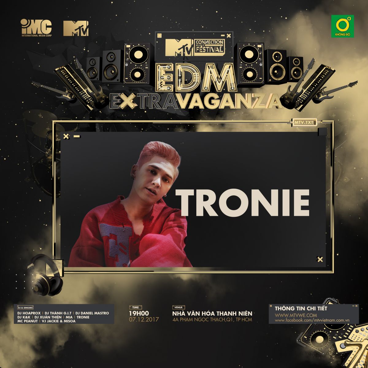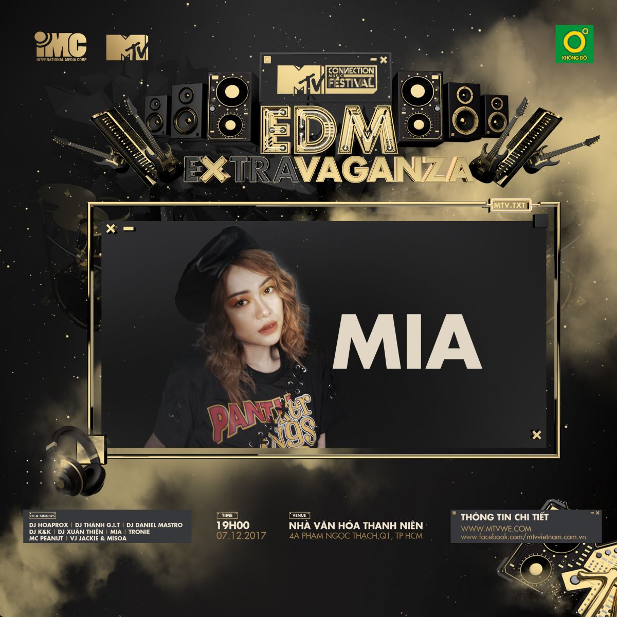 MTV Connection tháng 12/2017, EDM Extravaganza sẽ là một bữa tiệc âm nhạc nhiều màu sắc và tưng bừng vào dịp cuối năm. Là sân chơi mà các tín đồ EDM không thể bỏ qua. Với dàn DJ Lineup cực chất, Hoaprox-Quán quân The Remix 2017, Thành Gi.T-Phù thuỷ EDM phối hợp cùng Daniel Mastro, cùng với sự xuất hiện chất lừ của 2 khách mời Tronie – MiA, EDM Extravaganza chắn chắn sẽ là một đêm nhạc hoành tráng để khép lại 2017.