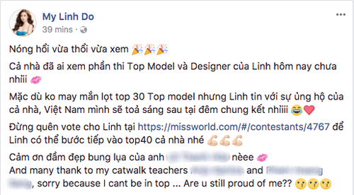 Đỗ Mỹ Linh xin lỗi vì không lọt top 30 và mong khán giả vẫn tiếp tục bình chọn để cô có thể bước vào top 40.