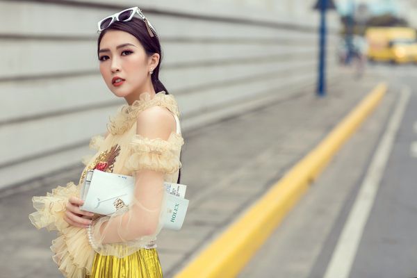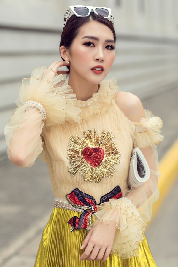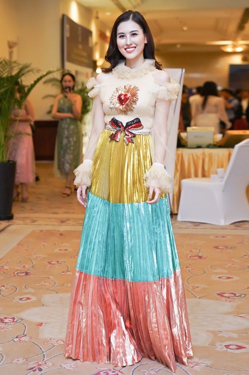 Đó cũng là lần đầu tiên người đẹp xuất hiện trước công chúng sau khi trở thành Á hoàng 1 Nữ hoàng Trang sức Việt Nam. Chiếc váy chia thành nhiều tầng màu sắc, thân trên là vải xuyên thấu đắp bèo nhún rất cầu kỳ.