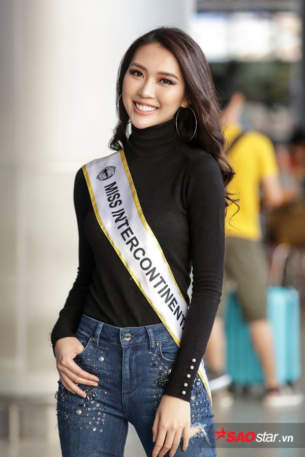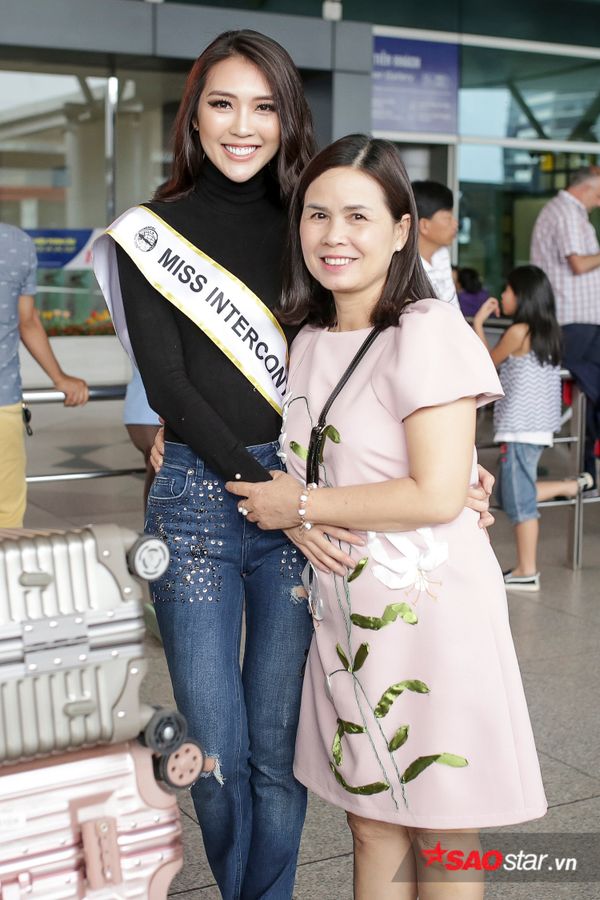 Đến tiễn tại sân bay, mẹ người đẹp gốc Phú Yên ân cần chỉnh sửa trang phục sao cho con gái thật chỉn chu và đẹp mắt trước mặt mọi người. Người đẹp diện áo thun đen ôm sát, khoe trọn vòng eo con kiến đáng ngưỡng mộ, kết hợp quần jean năng động, trẻ trung.
