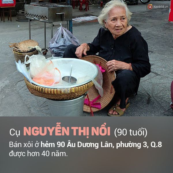 Cụ Nguyễn Thị Nổi (90 tuổi) bán xôi ở hẻm 90 Âu Dương Lân, P3, Quận 8. Cụ Nổi bán xôi được hơn 40 năm, giá mỗi gói xôi là 5 nghìn đồng nhưng rất ngon được các bạn học sinh yêu thích. Cụ bán từ lúc 4h chiều đến khi nào hết xôi rồi về. Buổi tối nếu không hết xôi cụ lại lang thang các con hẻm gần đó để mời bán. Cụ cho biết bán xôi mưu sinh để chăm lo cho con cháu.